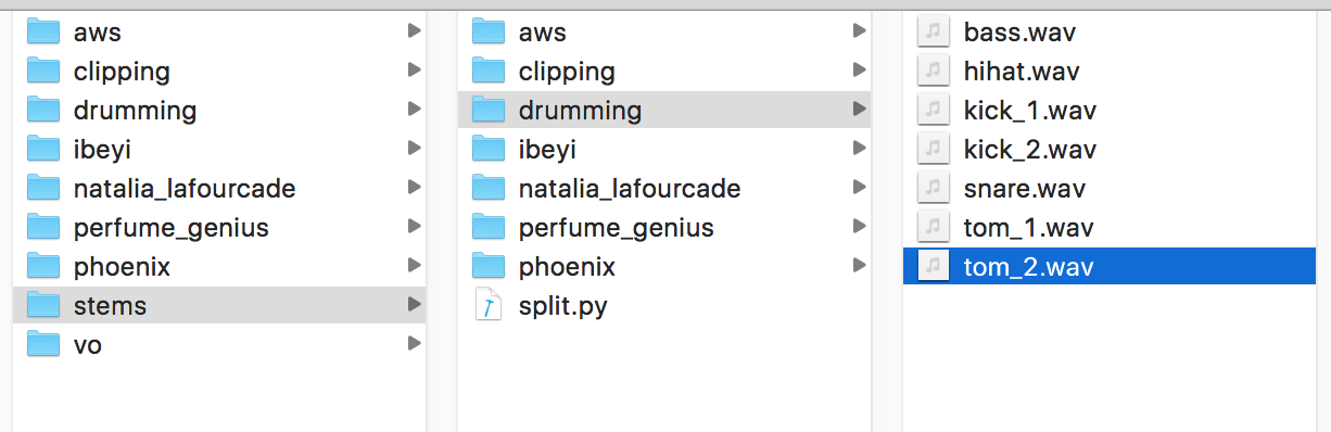 First, export the stems of your song as wav and so that they all line up at the beginning. Create a folder for your song in the audio/stems folder. For example our demo song is called ‘drumming’.
