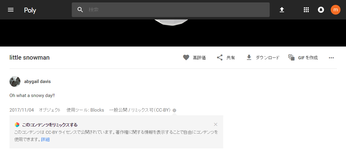 Polyで公開されているデータはすべてダウンロード可能というわけではなく、クリエイティブ・コモンズ(CC-BY 3.0)ライセンスが付いているもののみ可能です。